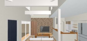 当初は平屋からのお話しでしたが、天井を高く構造材をあらわしにしていく事や二階のファミリースペースと空間を繋げたりと内観パースやウォークスルーでイメージしながら進めて行きました。