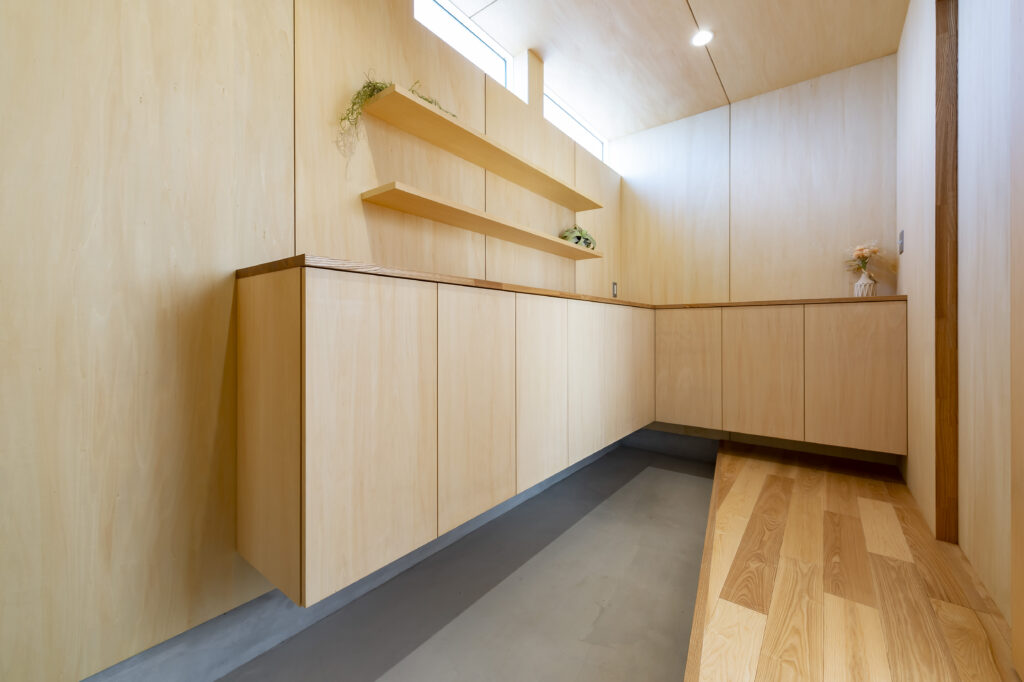 玄関収納は造作しており、壁などに使用した木と同じものを使用していて統一感がありますよね♪