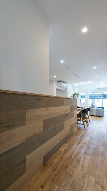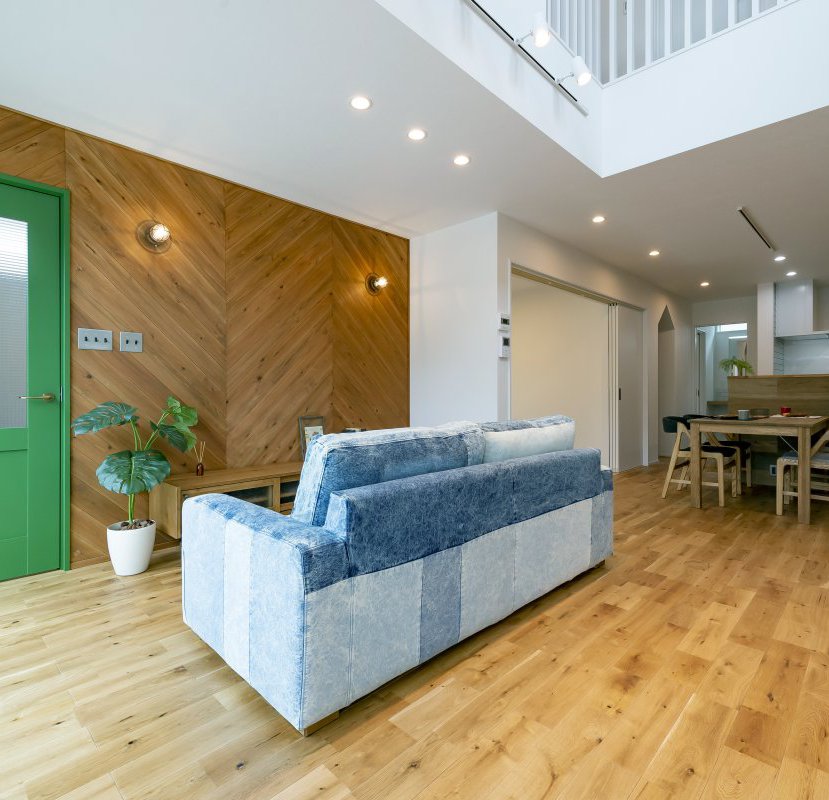 ヘリンボーンのアクセントウォールがあるリビングが目を引きます。