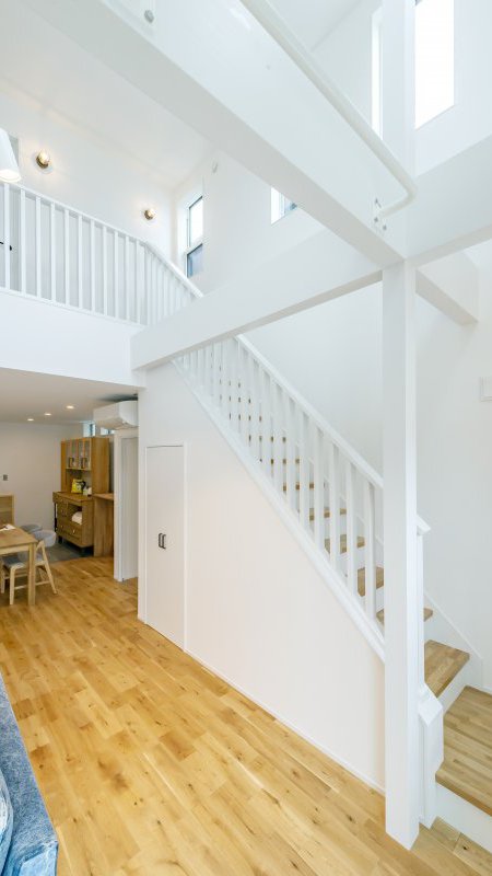 ヘリンボーンがアクセントの吹き抜けのあるリビング。