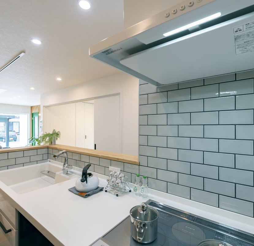白いキッチンにブルーのタイルでカリフォルニアらしさを演出。