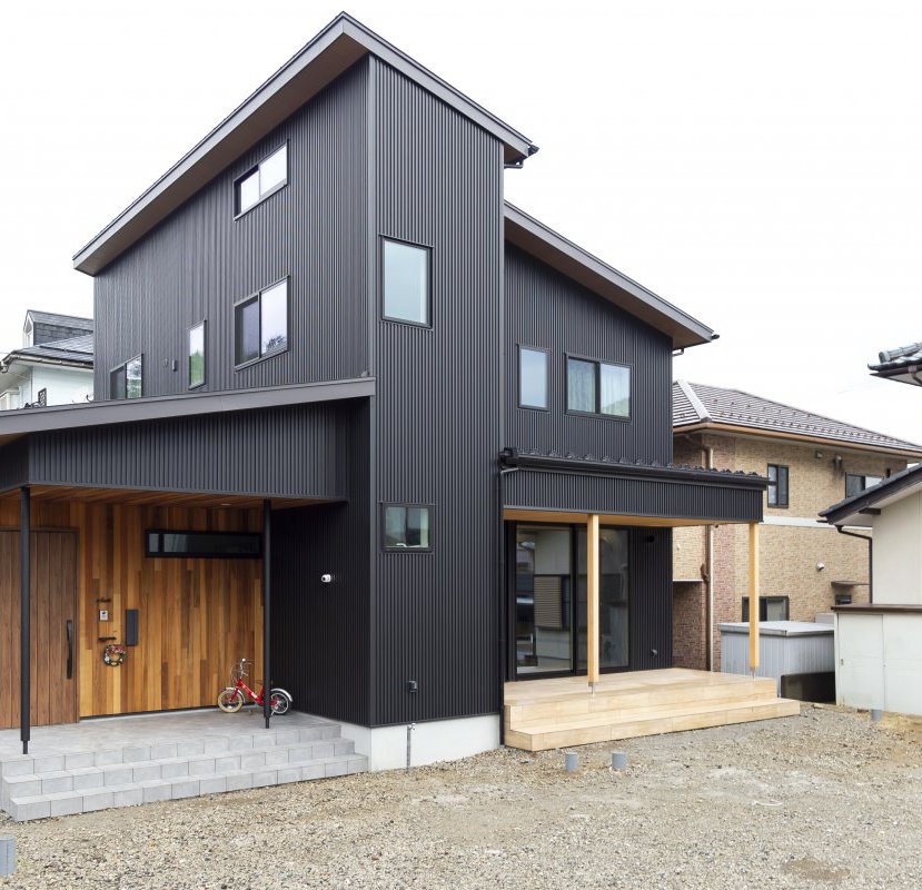黒のガルバリウム鋼板とウエスタンレッドシダーを使った、カッコイイ外観。