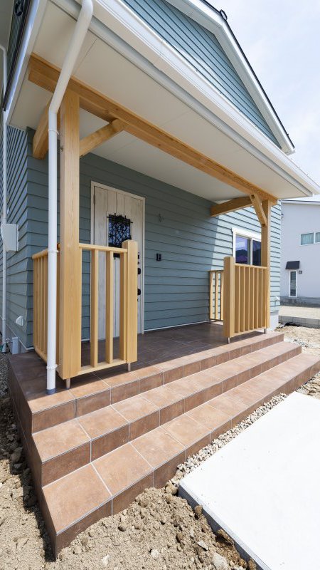 優しいグリーンの外壁と白い玄関ドアが良いコントラストに。