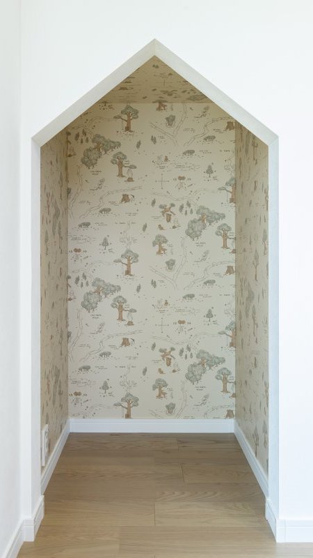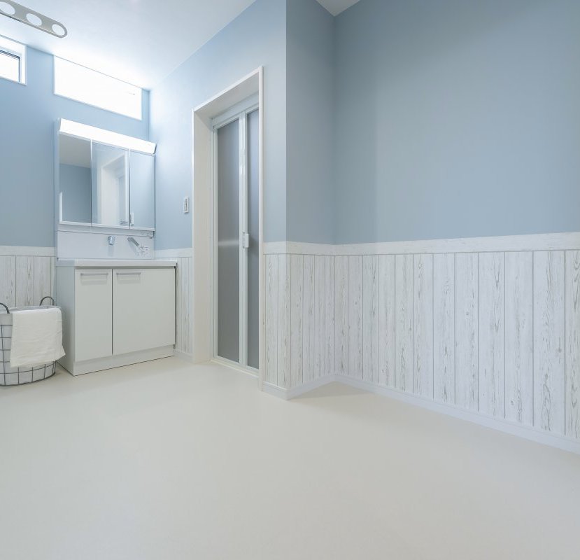 淡いブルーと白の木目調の壁紙が爽やかな脱衣所兼サンルーム。