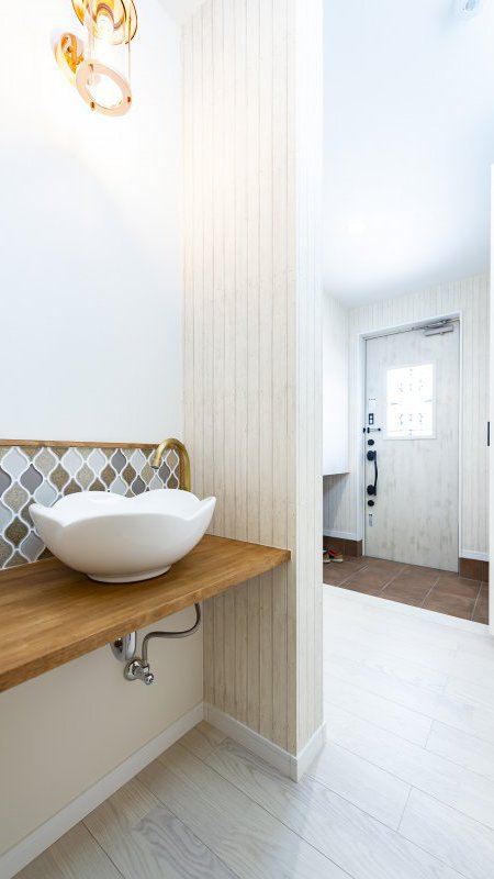 玄関近くに設置した手洗いは、照明器具とタイルがオシャレさをアップしています。