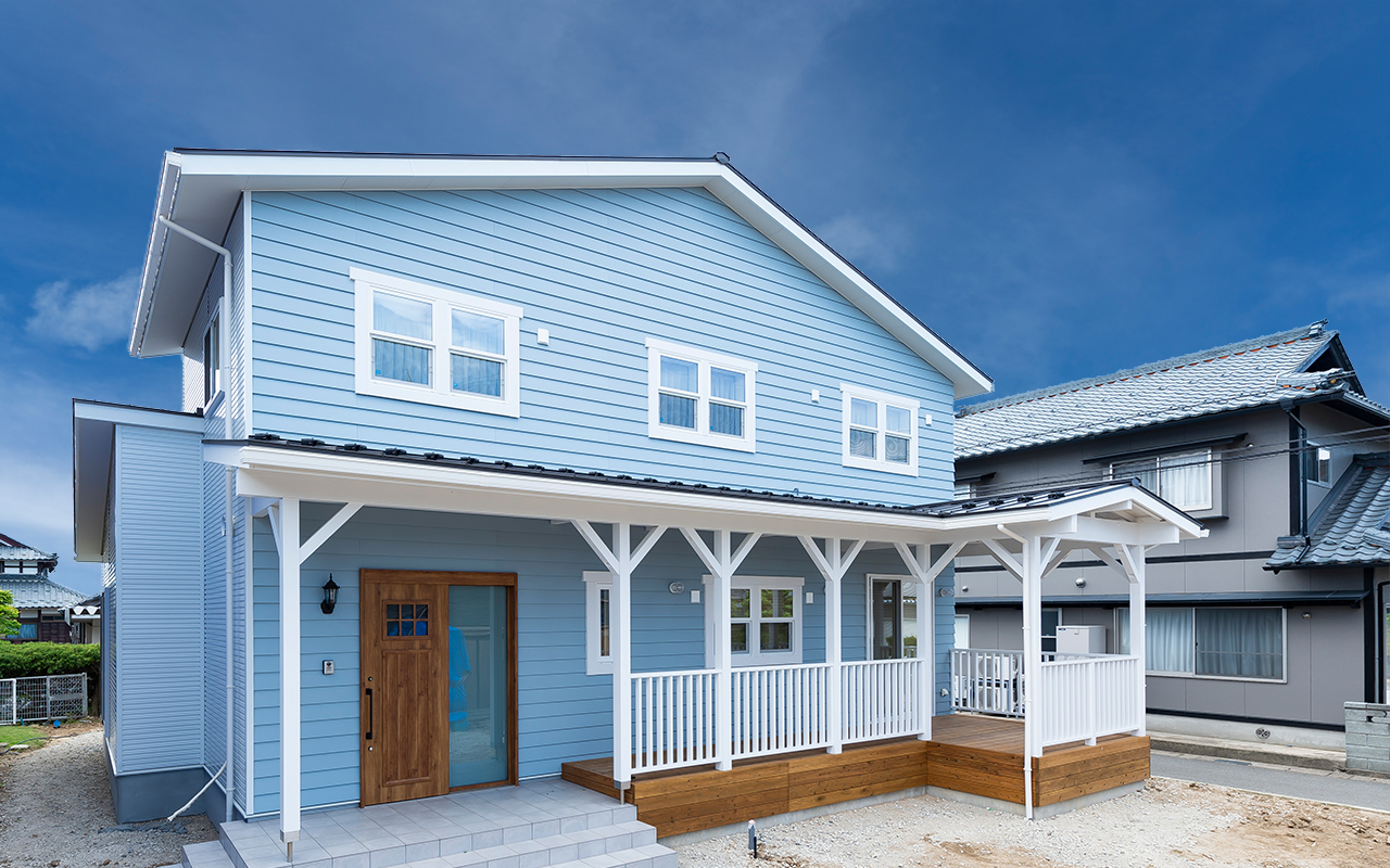 カバードポーチのウッドデッキとスカイブルーを基調とした外観が爽やかな印象を与えるカリフォルニアスタイル。