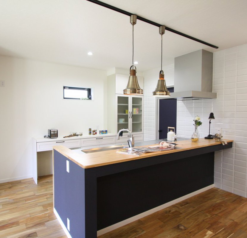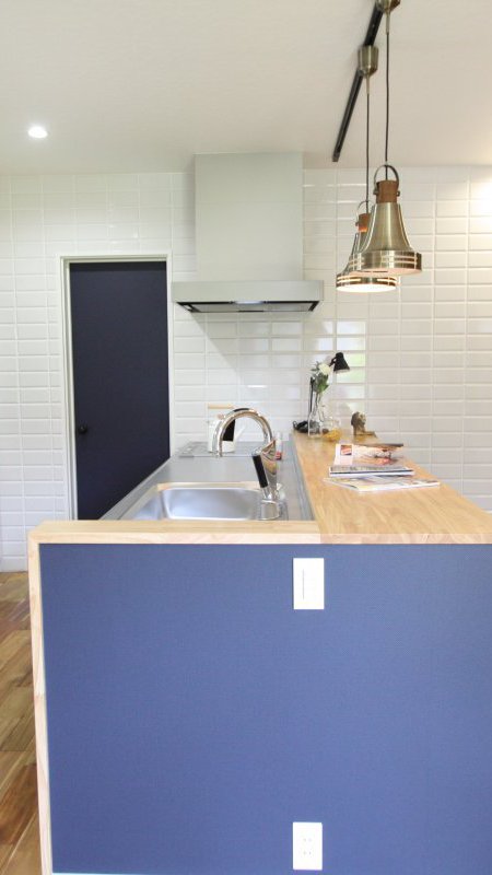 キッチンの腰壁のカラーにもなっているネイビーブルーと、