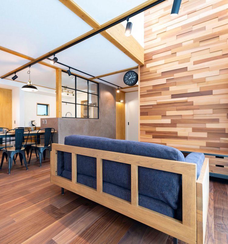 木目調のアクセントウォールが映える