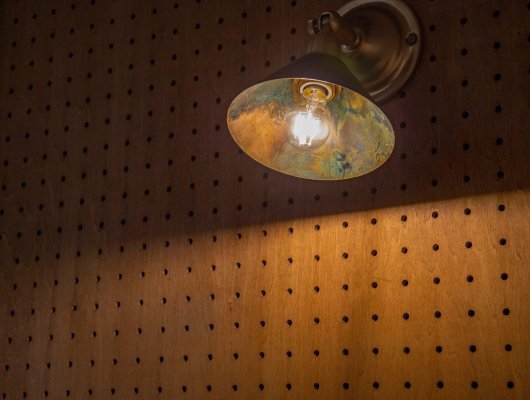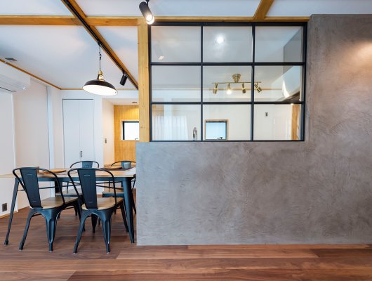 造作格子窓や有孔ボード、壁付け時計、スイッチ、