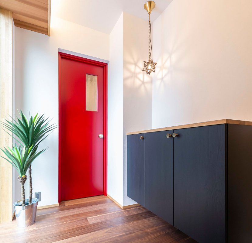 赤いドアが映えるエントランス。