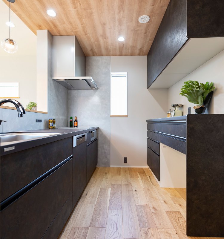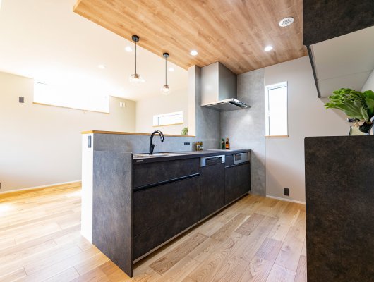 リビングの折り上げ天井、キッチンの折り下げ天井など