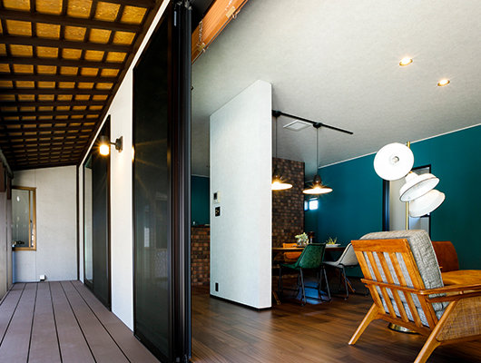 大開口のテラス窓を開けるとウッドデッキに繋がり