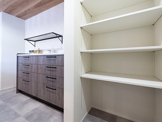 キッチンの横にパントリーと冷蔵庫が隠せるスペースも
