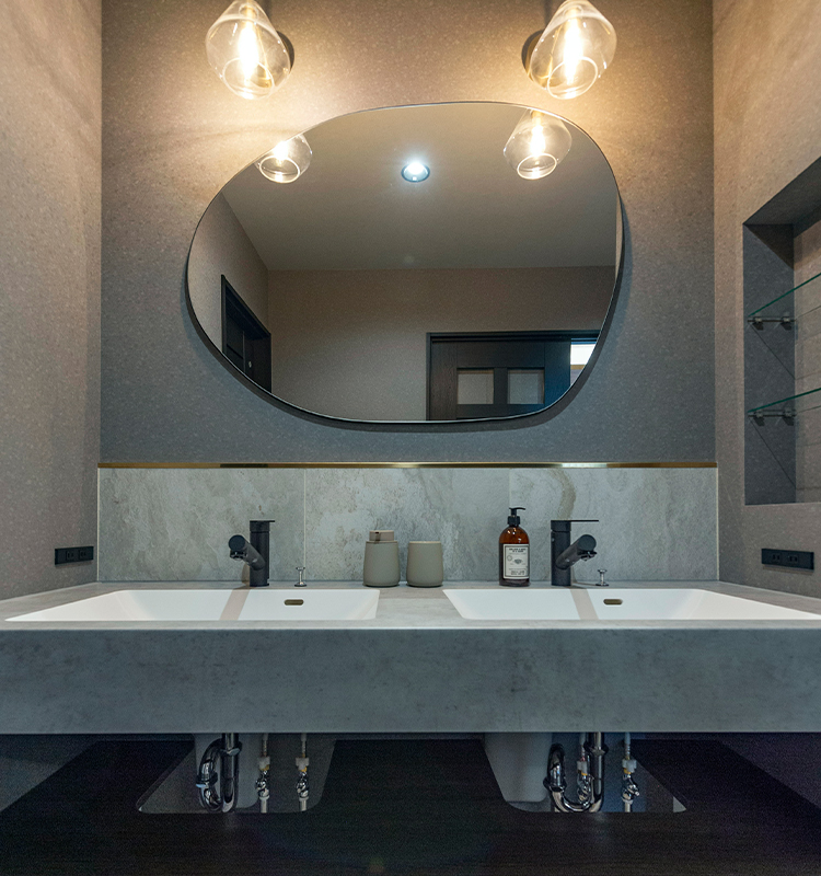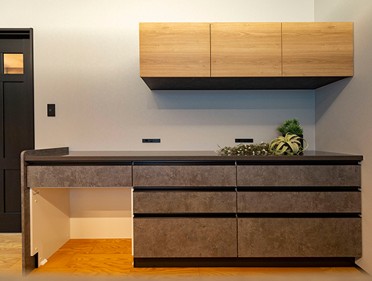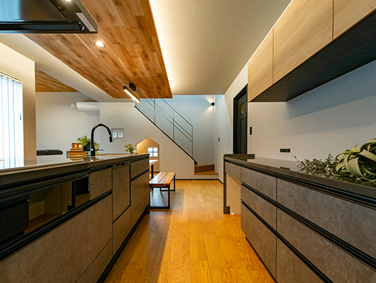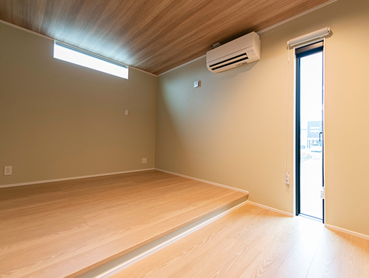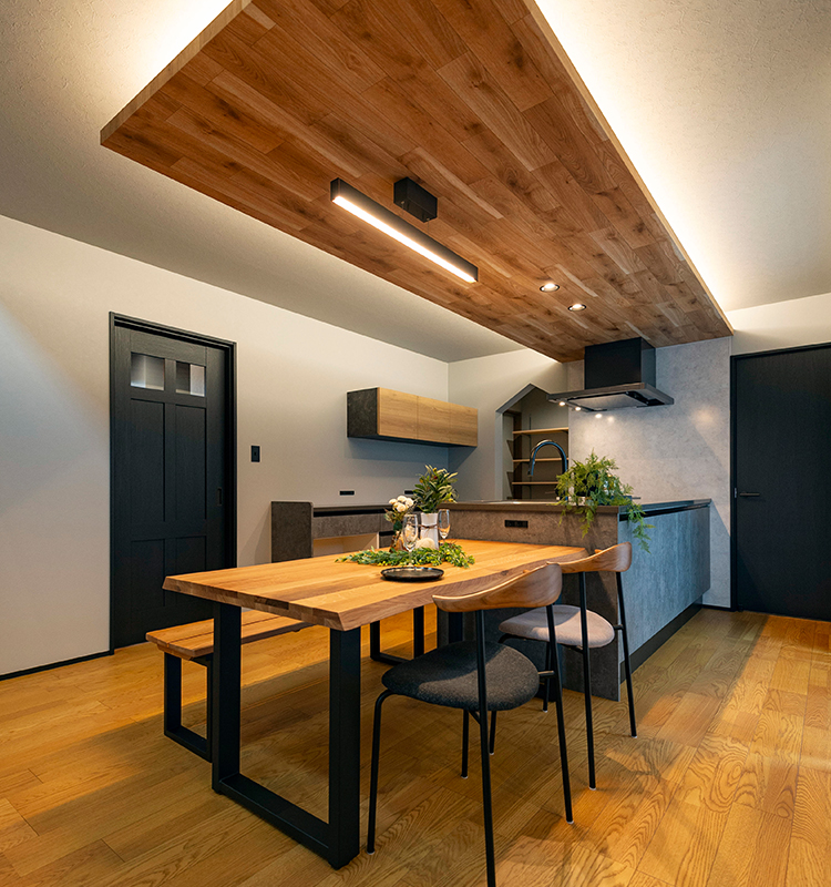勾配天井とテレビ壁のタイル・間接照明がステキな