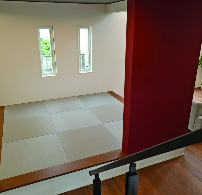 畳コーナーの壁に赤のクロスを使い、オシャレなアクセントに。