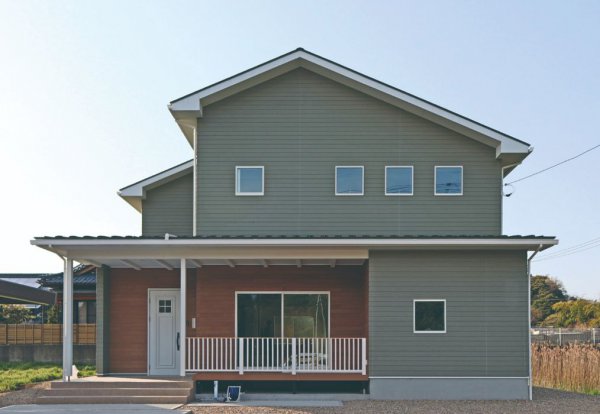 カバードポーチとグリーンのよろい貼りサイディングでカリフォルニアスタイルのお家です。