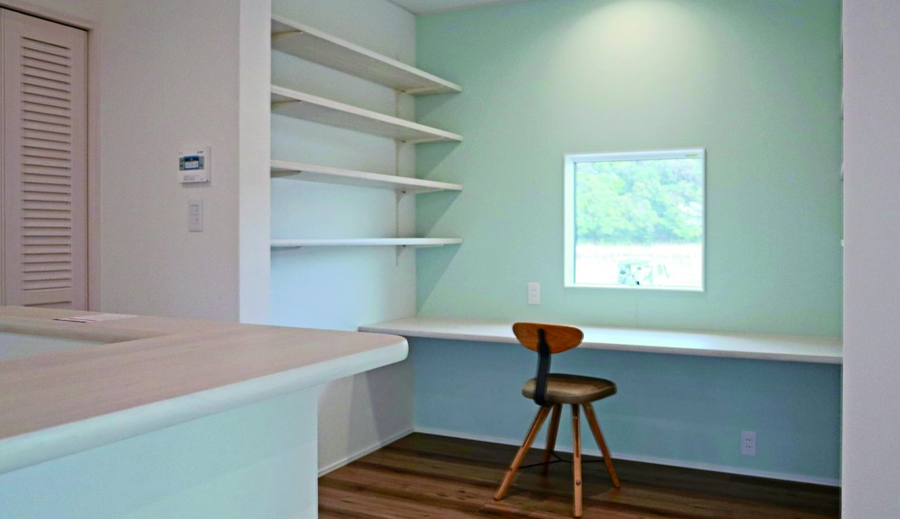 LDKに隣接したスタディコーナーは両側に可動棚があります。