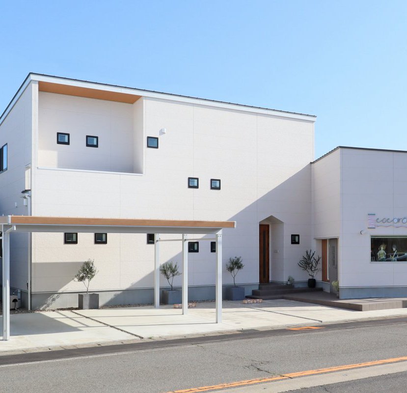 外壁をホワイトのサイディングで統一したシンプルな外観の店舗併用住宅。
