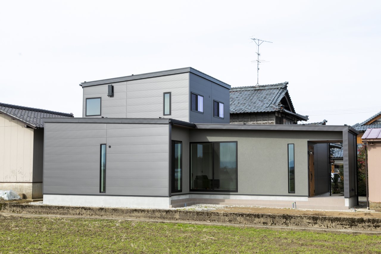 ブラックの金属サイディングに塗り壁を合わせたクールな外観。