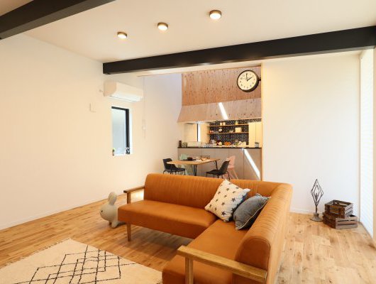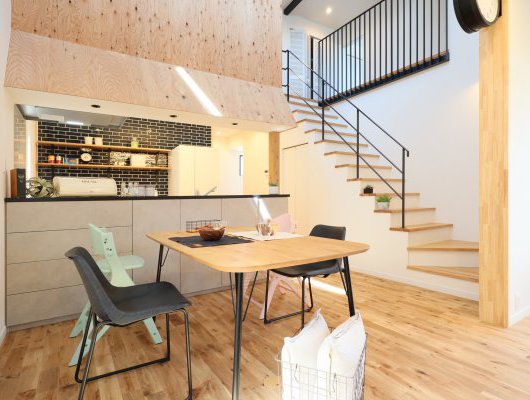 リビングには羽目板をヘリンボーン調に貼り、アクセントに。