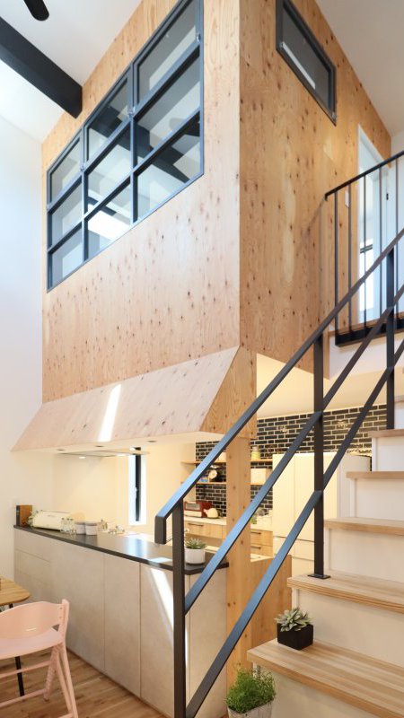 吹抜けに面する寝室には造作窓を設置し、開放感をプラス。