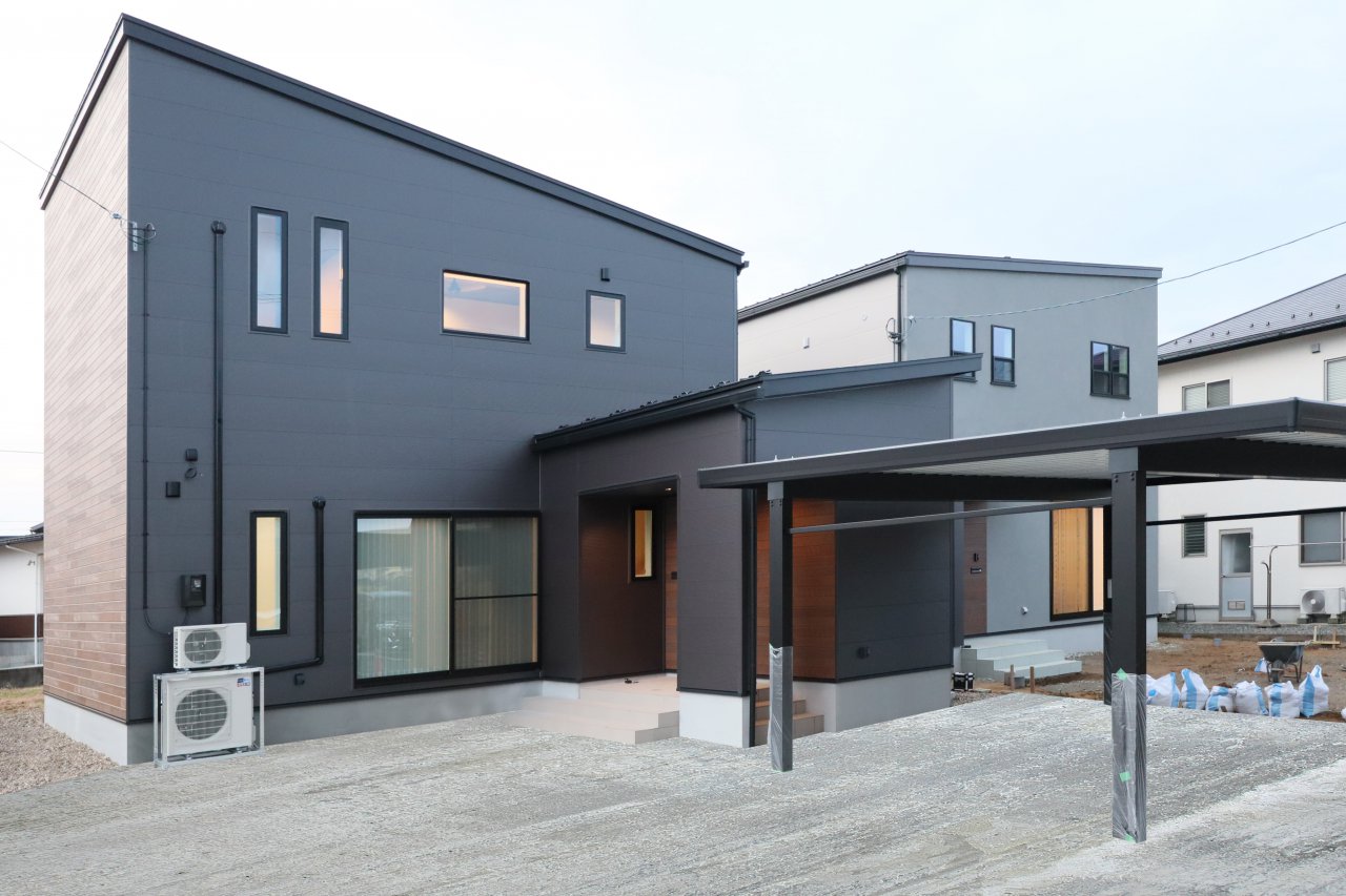 ブラックの金属サイディングに木目調のサイディングを合わせたモダンな外観。
