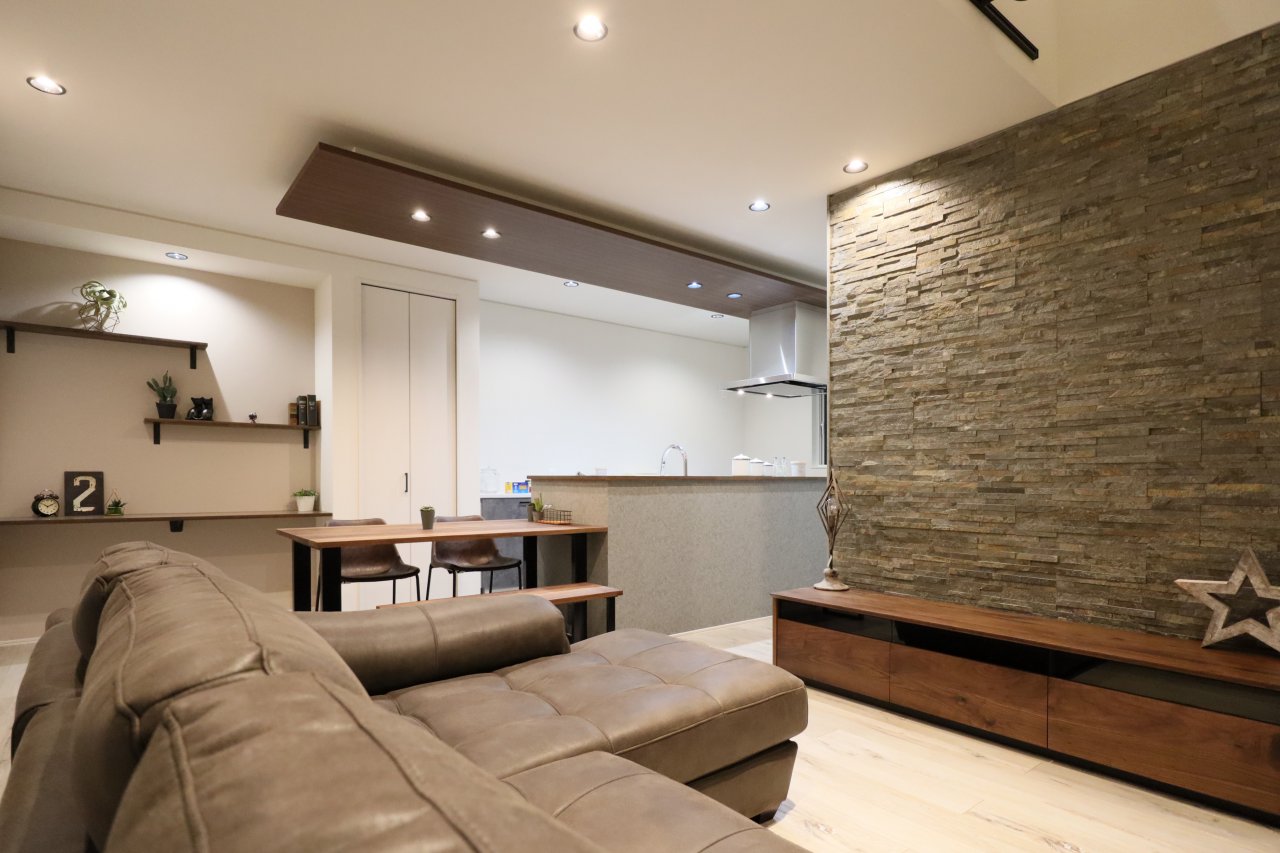 TVボード部の壁にはタイル貼りで大人な雰囲気を演出。