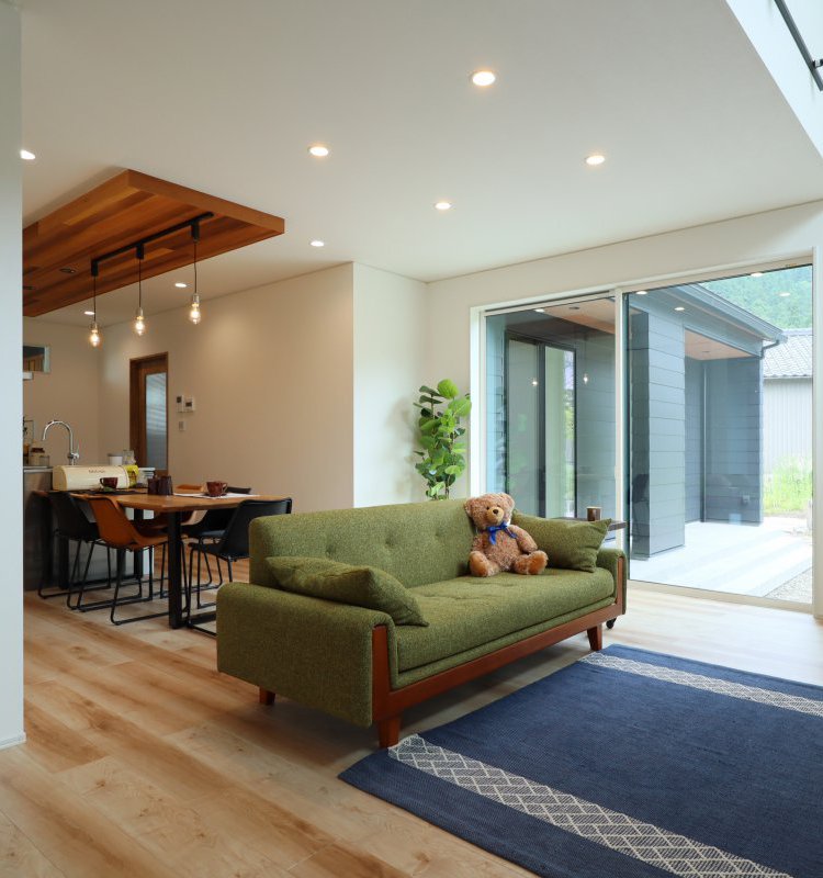 大きな窓で繋がるリビングとL字デッキ。リビングの大きな窓と、広いL字リビングが