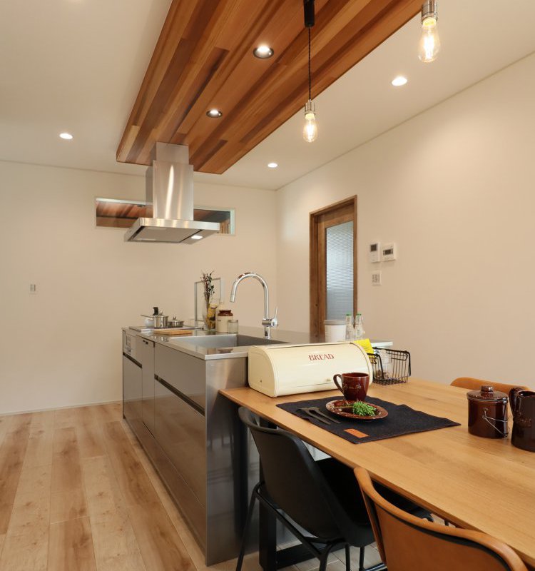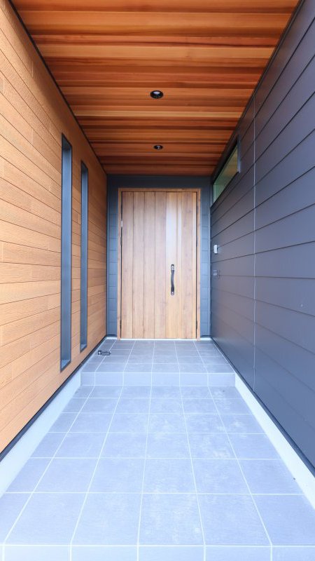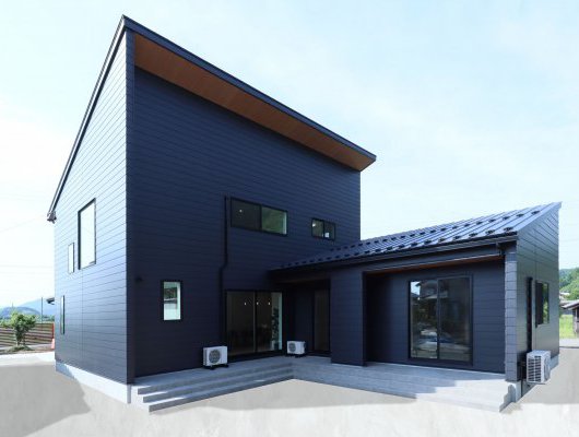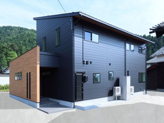 ブラックの鎧張りと木目がスタイリッシュな外観に
