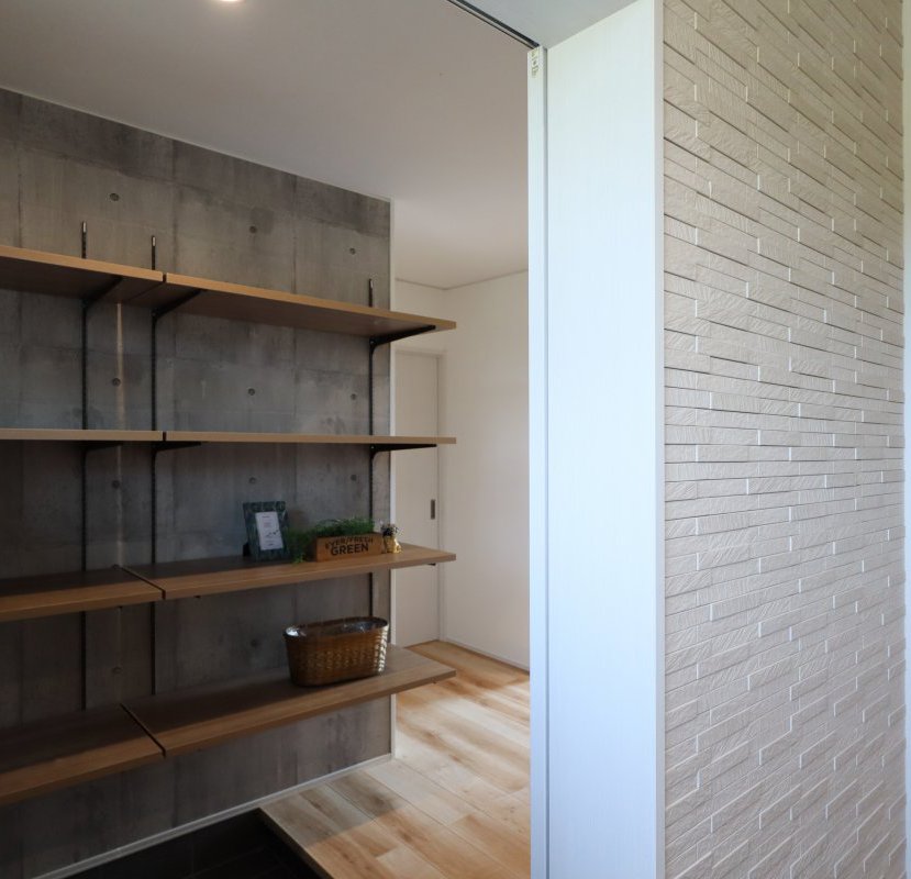 脇玄関のシューズクロークのクロスなどにもこだわりを。