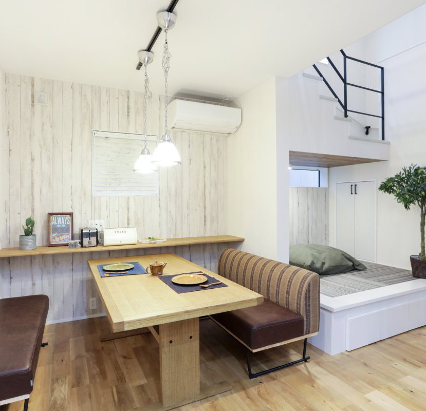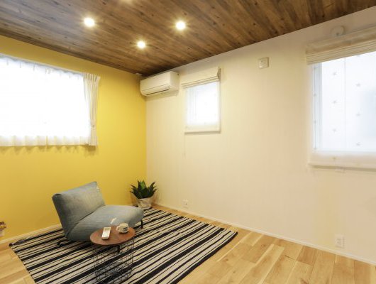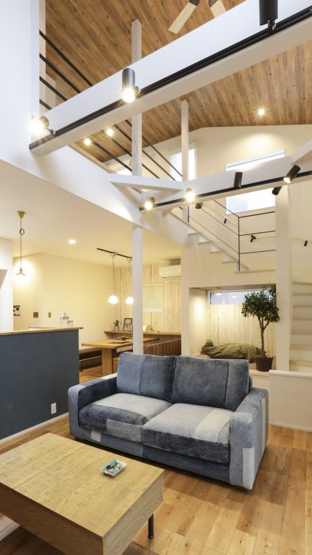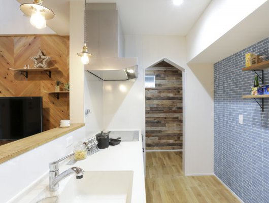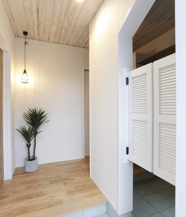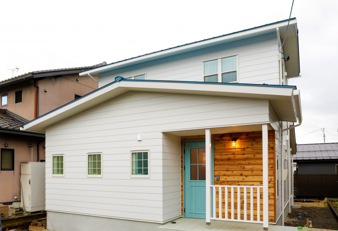 カリフォルニアスタイルの外観。水色の玄関ドアがポイント。
