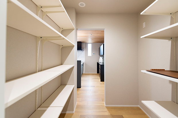 玄関からパントリーへストック品や食品を収納しながらキッチンへ抜けられる